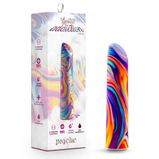 Are you ready for your newest addiction? The Limited Addiction Psyche Power Vibe is a colorful and sleek vibrator that delivers 10 deep, rumbly vibrations with the superior RumbleTech motor! Cycle through 5 powerful speeds and 5 unique and thoughtfully curated patterns using the two button design to find your perfect pleasure preference. IPX7 submersible waterproof for bath and shower play and USB magnetic rechargeable, the Psyche Power Vibe is easy to clean and even easier to use. It has a smooth, sensual satin feel and it contains no phthalates, paraffins, latex, or fragrance.